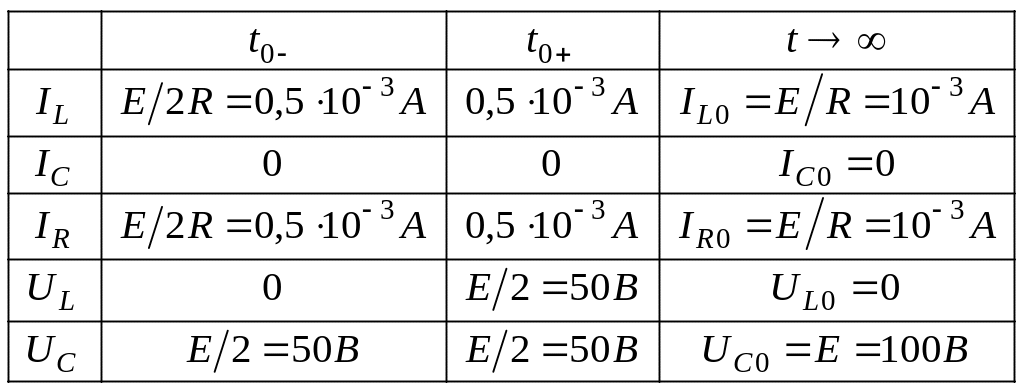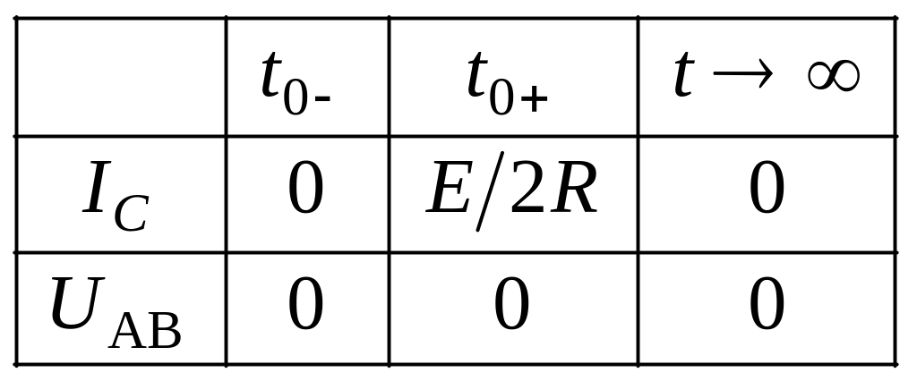 При нарастании времени переходного процесса частота p переходного процесса падает. В результате сопротивление индуктивности pL падает, сопротивление емкости 1/pC растет. В пределе, при t , сопротивление индуктивности становится равным нулю, сопротивление емкости – бесконечно большой величине. Такая частотная интерпретация, аналогично законам коммутации, может быть использована для анализа начальных условий задачи о переходном процессе и составления таблицы.