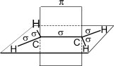 В результате каждый атом углерода обладает тремя гибридными sp2 -орбиталями, оси которых находятся в одной плоскости под углом 120º друг к другу, и одной негибридной гантелеобразной p-орбиталью, ось которой расположена под прямым углом к плоскости осей трех sp2 -орбиталей. Одна из трех гибридных орбиталей атома углерода перекрывается с подобной орбиталью другого атома углерода, образуя s- связь. Каждая оставшаяся гибридная орбиталь атомов углерода перекрывается с s- орбиталью атомов водорода, приводя к образованию в той же плоскости четырех s- связей C–H. Две негибридные p- орбитали атомов углерода взаимно перекрываются и образуют p- связь, максимальная плотность которой расположена перпендикулярно плоскости s- связей. Следовательно, двойная связь алкенов представляет собой сочетание s- и p- связей.