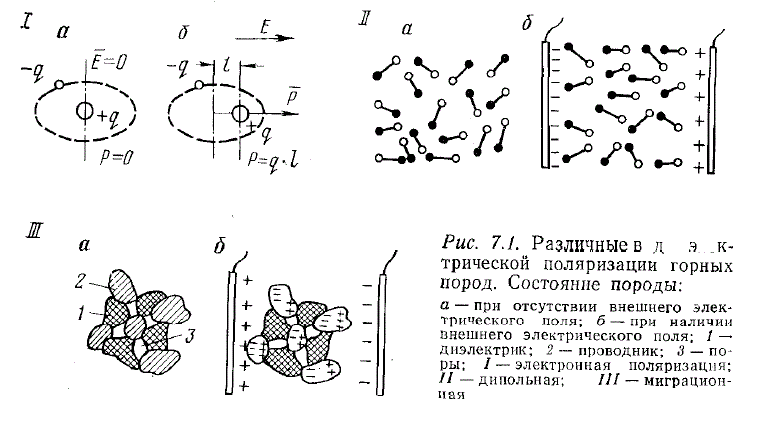 При внесении породы в электрическое поле свободные элек-троны и ионы, содержащиеся в проводящих и полупроводящих включениях, начинают перемещаться в пределах каждого вклю-чения. В результате каждое включение приобретает дипольный момент и ведет себя подобно большому диполю.
