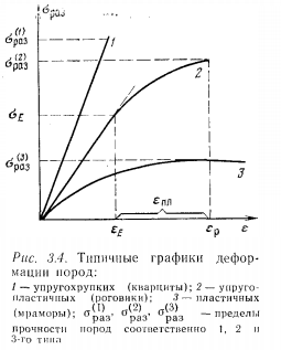 В зависимости от соотношения величин этих деформаций горные породы могут быть подразделены на упругохрупкие (пластическая зона практически не наблюдается вплоть до разрушения), упругопластичные (разрушающей деформации предшествует зона пластической деформации) и пластические (упругая деформация практически отсутствует).