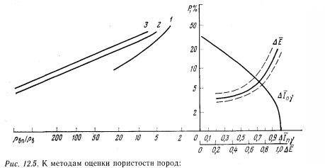 Inymax - интенсивность вторичного v- излучения соответственно напротив данного пласта , минимальное и максимальное в карбонатах; по данным ПС ΔE=ΔE*/ΔEmax (по Б. Ю. Вендельштейну), где ΔE*, ΔEmax— потенциалы собственной поляризации напротив изучаемого пласта и максимальный; по электрокаротажу для песков (1 ), песчаников (2), плотных известняков (3) (по В. Н Дахнову)