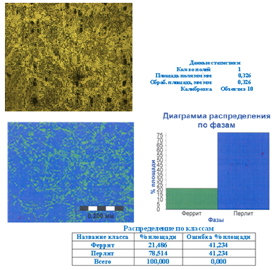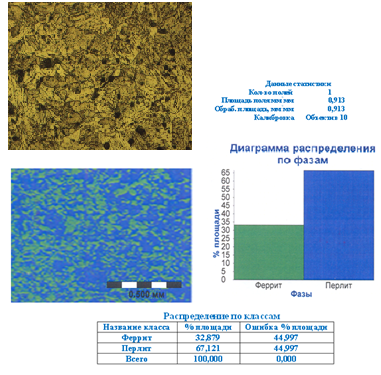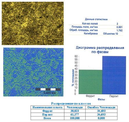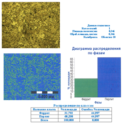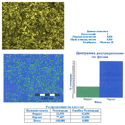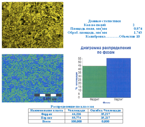Рисунок 2.12 – Микроструктура и диаграмма распределения по фазам стали Ст3сп с содержанием углерода 0,22 %