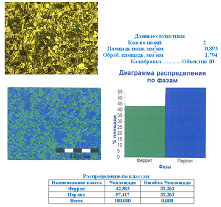 Рисунок 2.10 – Микроструктура и диаграмма распределения по фазам стали Ст3сп с содержанием углерода 0,20 %