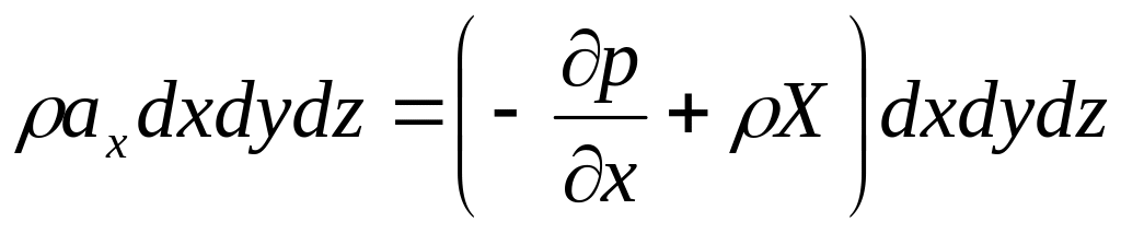 Силы гидродинамического давления, так же как для частицы, находящейся в равновесии, действуют на изолированной поверхности; массовые силы пропорциональны массе частицы; силы инерции определяются произведением массы на мгновенное значение ускорения ее движения. В проекциях на оси координат сумма этих сил, действующих на рассматриваемую частицу, составляет: