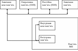 Внутрішня кеш-пам’ять – це оперативна пам’ять статичного типу ємністю 1-16 кБ, яку вбудовано безпосередньо у МП. Вона працює на тактовій частоті процесора. Зовнішня кеш-пам’ять являє собою також пам’ять статичного типу, однак має значно більшу ємність. Встановлюється на системній платі і працює на частоті шини. Ємність зовнішньої кеш-пам’яті в сучасних персональних ЕОМ становить 1 Мбайт і має тенденцію до збільшення.