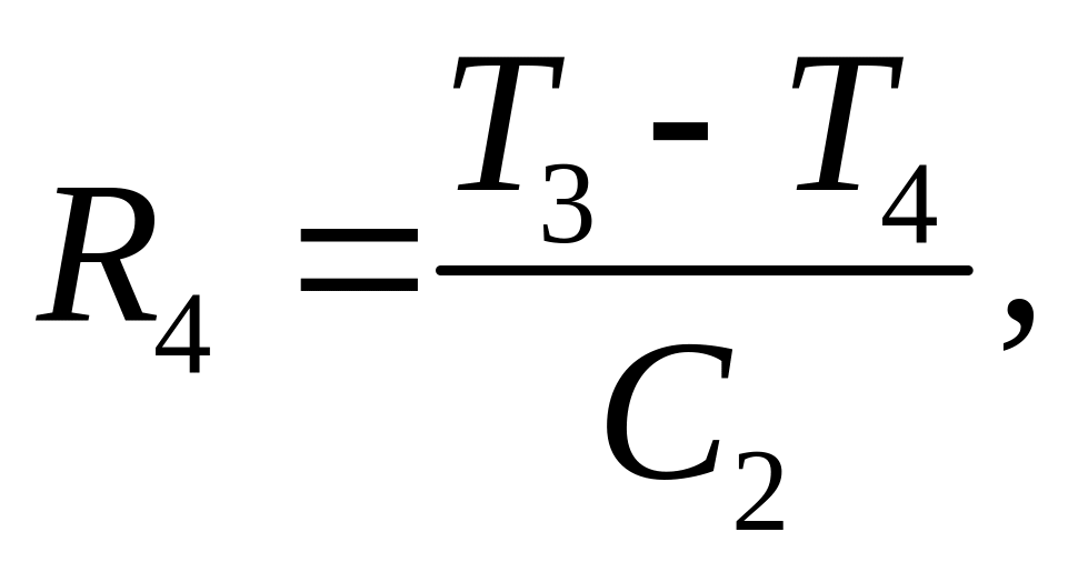 Рассматриваемому примеру соответствует коррекция вида, указанного на рис. 4 д. Частота сопряжения 1=1/Т1; 2=1/Т2; 3=1/Т3 и 4=1/Т4 легко получаются, если взять антилогарифм (десятичный) абсцисс, приведенных на рис. 3. По (3.7) можно составить систему пяти уравнений (четыре постоянные и k1=R6/R4 c шестью неизвестными параметрами). Поэтому один из параметров необходимо определить. Рекомендуется задать значение С2=1 мкФ, а остальные параметры получить из решения системы уравнений