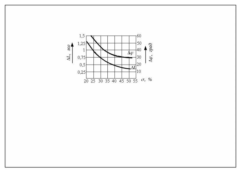 Показатели качества переходного процесса в замкнутой САУ зависят от запаса устойчивости по фазе (=180–|р(с)|) и по амплитуде L(L равно абсолютному значению Lр при частоте, где |р|=180). В частности это иллюстрируется на рис. 2, где представлены зависимости перерегулирования в замкнутой САУ по задающему воздействию и L.