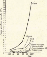 Потребление энергоресурсов быстро растет, что вызывается непрерывным увеличением мирового промышленного производства (рис. 1.4). Предполагается, что к 2000 г. потребление энергоресурсов составит 160—240 тыс. ТВт-ч (что соответствует условному топливу массой 20—30 млрд. т). Оставшихся после 2000 г. мировых