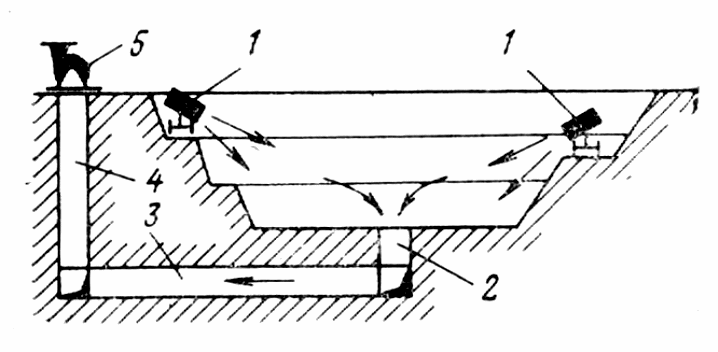 передвижными вентиляторными агрегатами 1 и он направлен ко входу в вентиляционный шурф 2, связывающий рабочее пространство карьера сподземными выработками 3 дренажной шахты 4. Стационарный вентиля-торный агрегат 5 отсасывает воздух из дренажной шахты, обеспечивая не-обходимый перепад давлений и поступление воздуха в вентиляционный шурф и подземные выработки, как это показано стрелками на рисунке.