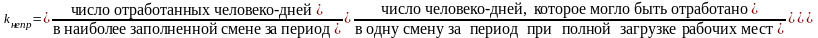 Разность между числителем и знаменателем данного коэффициента показывает потери рабочего времени в наиболее заполненной смене в результате неполной загрузки рабочих мест.