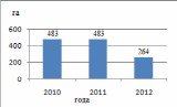 Рисунок 1.4 – Диаграмма «Площадь сенокосов» Проанализировав диаграмму на рисунке 1.5 можно отметить, что в период с 2010 по 2011 гг. площадь пастбищ оставалась неизменной и составила 483 га. В 2012 г. данный показатель уменьшился на 219 га и составил 264 га.
