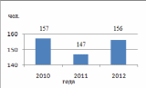 Рисунок 1.5 – Диаграмма «Площадь пастбищ» Исследовав диаграмму на рисунке 1.6, можно отметить, что среднегодовая численность работников в 2010 г. составила 157 чел., в 2011 г. данный показатель уменьшился на 10 чел. и составил 147 чел., а в 2012 г. изучаемый показатель увеличился на 9 чел. и составил 156 чел.