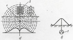 Для определения трассы КЛ электромонтер с приемной рамкой, усилителем и телефоном с кабелеискателями передвигается вдоль кабеля, слегка перемещая кабелеискатель поперек оси КЛ. Ось рамки должна располагаться вертикально поверхности земли, при этом в телефоне наблюдается минимальная громкость звука. При отклонении рамки влево или вправо от оси кабеля в телефоне сначала возрастает громкость звука, а затем снижается (рис. 39, а).