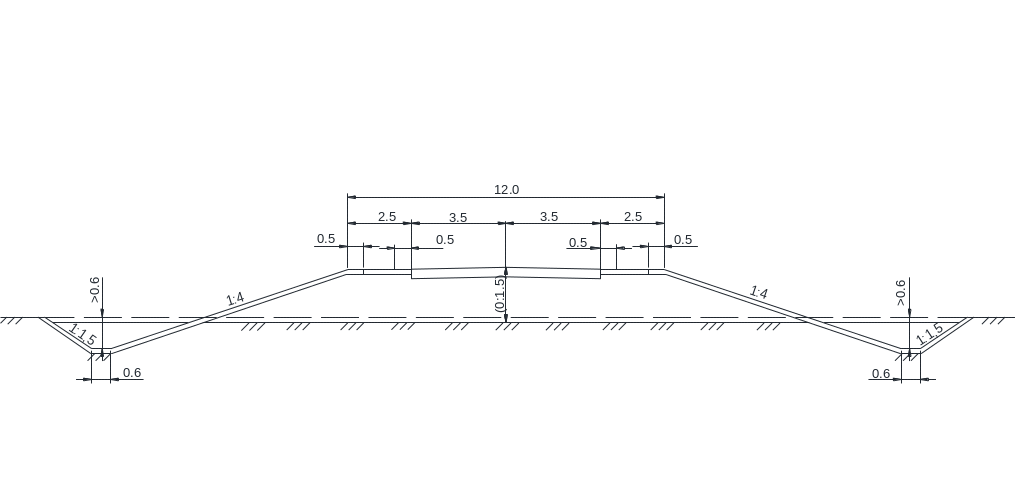 Рис 4.1. 1-й тип поперечного профиля (насыпь до 1,5 м) с откосами к 1:4, канавы с двух сторон.