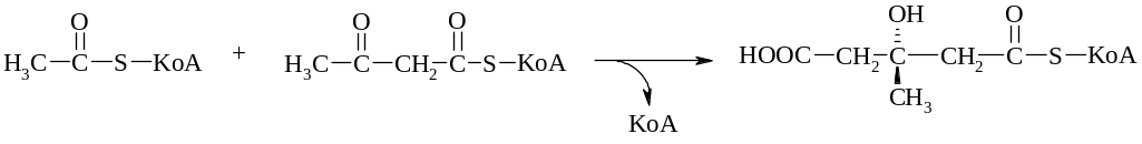 Центральным метаболитом в биосинтезе мавалоновой кислоты является 3-гидрокси-метилглутарил-КоА. Образование мевалоновой кислоты начинается с конденсации молекул ацетил-КоА и ацетоацетил-КоА. На первой стадии образуется молекула 3-гидрокси-3-метилглутарил-КоА.