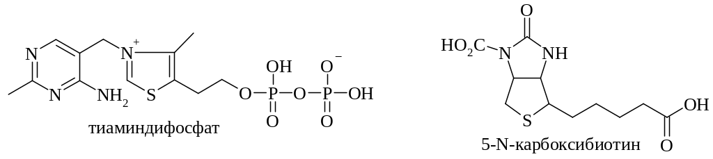 В состав многих ферментов, помимо полипептидных цепей из десятков, сотен и тысяч молекул аминокислот, составляющих специфическую белковую (протеиновую) его часть, входит одна или несколько молекул относительно низкомолекулярного органического соединения небелковой природы (основания, кислоты, спирта, кетона и т. д. алифатического, алициклического или гетероциклического ряда) – так называемая простетическая группа, или кофермент. В таком случае протеиновая часть фермента называется апоферментом. В состав некоторых ферментов также входят неорганические кофакторы – ионы металлов Fe, Co, Сu, Мn и др.