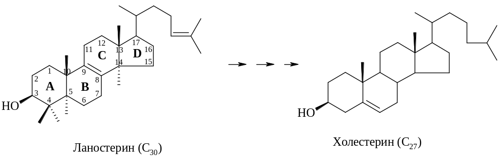 включает потерю трех метильных групп, восстановление двойной связи в боковой цепи и миграцию 8,9-двойной связи в 5,6-положение. Во время превращения ланостерина в холестерин метильные группы при С-4 элиминируются в виде диоксида углерода, а метильная группа при С-14 – в виде муравьиной кислоты.