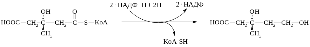 Далее происходит НАДФ-зависимое восстановление 3-гидрокси-3-метилглутарил-КоА в мевалоновую кислоту