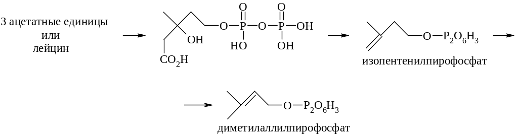На первой стадии изопентенилдифосфат взаимодействует с 3,5-диметилаллилдифосфатом с образованием соединения состоящего из 10 атомов углерода – геранилдифосфата.