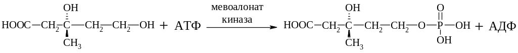 На первом этапе мевалоновая кислота фосфорилируется с образованием 5-фосфомевалоновой кислоты