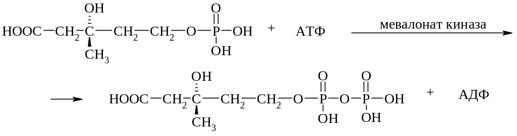 Далее на 5-фосфомевалоновую кислоту переносится еще одна фосфатная группа от АТФ с образованием 5-дифосфомевалоновой кислоты