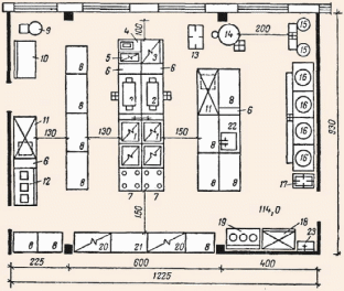 1 - плита электрическая четырехконфорочная ПЭСМ-4Ш; 2 - сковорода электрическая СЭСМ-0,5; 3 - шкаф жарочный электрический; 4 - фритюрница ФЭСМ-20; 5 - плита электрическая двухконфорочная для непосредственного жаренья; 6 - вставка к тепловому оборудованию; 7-мармит электрический МСЭСМ-50 для соусов; 8 - стол производственный СП-1470; 9 - универсальный привод ПГ-0,6; 10 - ^тол для установки средств малой механизации; 11 ~ стол охлаждаемый СОЭСМ-2; 12 - печь шашлычная; 13 - стеллаж передвижной; 14 - котел пищеварочный КПЭ-100; 15 - электрокипятильник КРНЭ-100Б; 16 - котел пищеварочный КПЭСМ-60; 17- ванна передвижная ВПГСМ для промывки гарниров; 18 - шкаф холодильный ШХ-0,4М; 19 - прилавок-мармит для первых блюд; 20 - стойка раздаточная электрическая СРТЭСМ; 21 - стойка раздаточная СРСМ; 22 - стол со встроенной моечной ванной СМВСМ; 23 - раковина