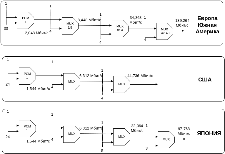 Технология PDH была разработана в начале 80-х годов. Было разработано три системы технологии: Американская, Японская, Европейская и Южно-Американская (рис. 2.1).