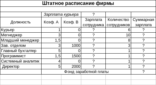 Общий фонд зарплаты составляет 100000 р. Необходимо определить, каким должен быть оклад каждого работника фирмы, если каждый оклад является функцией от оклада курьера, а именно: Зарплата = Ai*x+Bi,