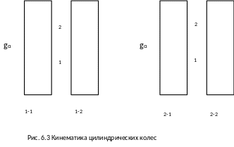 На рис.6.2 изображены зубья прямозубого колеса слева и косозубого – справа в двух проекциях. Верхняя проекция соответствует виду в направлении оси колеса (соответствует позиции 1 рис. 6.1), а нижняя проекция дает вид сбоку, что соответствует позиции 2рисунка 6.1. Косой зуб приобретает пространственную кривизну, что повышает его прочность на изгиб. Кроме того при одинаковой ширине прямозубого и косозубого колеса рабочая длина зуба косозубого колеса больше чем у прямозубого. Наклон зуба вызывает изменение кинематики косозубой передачи рис.6.3.