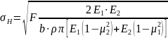Силы Fn, действующие в зоне контакта зубьев вызывают местную деформацию с образованием площадки контакта-А. На этой площадке возникают контактные напряжения -σH, максимальная величина которых является мерой напряженного состояния зуба и служит причиной накопления усталостных явлений и выкрашивания поверхностных слоев. Контактные напряжения возникают в деталях, у которых при работе площадь поверхности соприкосновения с другой деталью несоизмеримо мала по сравнению с размерами самой поверхности детали. Максимальная величина возникающих при этом напряжений может быть рассчитана с помощью теории контактных напряжений Герца (Herz). Она позволяет связать величину этих напряжений с размерами и формой поверхности тел и приложенными усилиями. Формула Герца имеет вид.