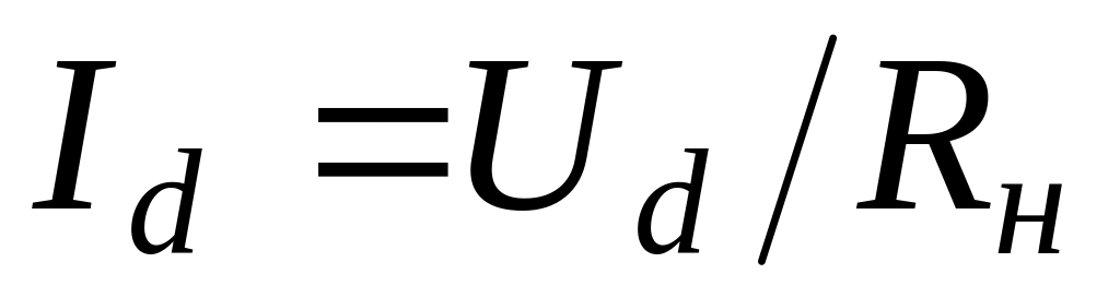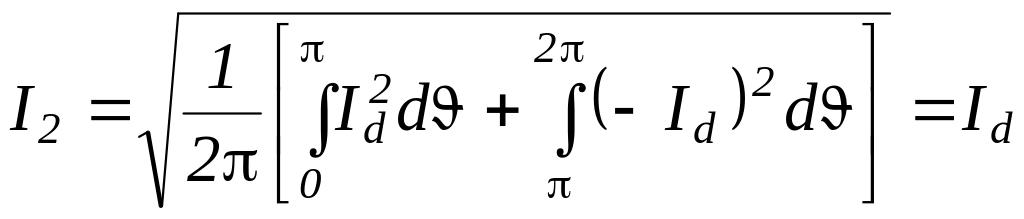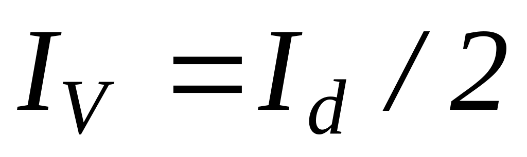 Ток нагрузки замыкается через вентили в первом полупериоде, а через – во втором, поэтому на интервале проводимости вентилей его ток повторяет форму тока нагрузки . Поскольку вентили выпрямителя работают поочередно, среднее значение тока одного вентиля вдвое меньше тока нагрузки , т. е.: