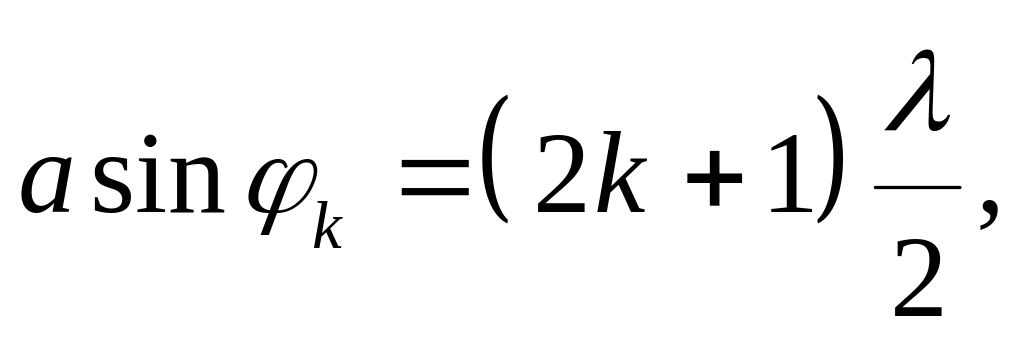 где а – ширина щели; k – угол отклонения (угол дифракции) лучей; k – номер минимума; длина волны;