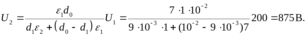 Разность потенциалов U2, которая устанавливается после удаления из зазора стеклянной пластины, определим из формулы (3.9), подставляя в нее формулы (3.10) и (3.11) и производя соответствующие преобразования: