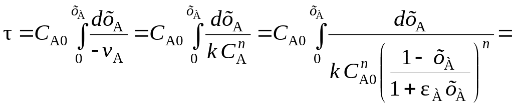 Изменение объема реакционной смеси в зависимости от степени превращения хА учитывают и при выводе характеристических уравнений реакторов. Так, например, характеристическое уравнение реактора идеального вытеснения (103) с учетом уравнения (111) записывается для реакции n-го порядка в виде