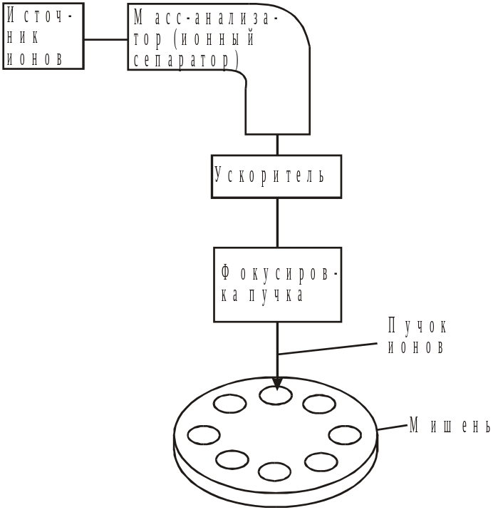 В установке для ионного легирования (рис. 20.3) атомы легирующего вещества под действием мощного электрического поля ионизируются и приобретают направленное движение. Энергия ионов определяется ускоряющим напряжением и кратностью ионизации. Пучок ускоренных ионов поступает в масс-сепаратор, где под действием сильного магнитного поля ионы разделяются по массам. Имеется возможность выделения строго одного сорта атомов, что позволяет сэкономить затраты на очистку легирующих веществ. В отличие от процессов диффузии и вплавления, которые являются равновесными и позволяют получать только термодинамически стабильные твердые растворы, при ионной имплантации возможно введение в приповерхностный слой любых примесей и в любых неравновесных концентрациях. Таким способом можно получать не только твердые растворы, но и разнообразные химические соединения (например нитриды, карбиды кремния) при низких температурах.