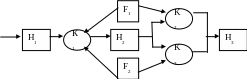 По технологическому циклу для выполнения заказа необходимо выполнить две фазы обслуживания: сначала обслуживание в канале К1, затем либо в К2, либо в К3. Операторы F1 и F2 обслуживают (поддерживают в работоспособном состоянии) каналы, причем F1 обслуживает К, и К2, a F2 — K1 и К3. Тогда в этой системе могут быть следующие состояния: