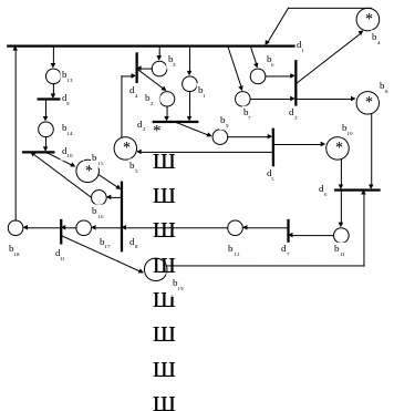 Начальное состояние рассматриваемой сети описывается следующим образом: ПР закончил выполнение операции по переносу пустой тары в зону 2 из накопителя 4 и освободился для выполнения следующей операции своего производственного цикла (условие b4 выполнено); пустая тара под готовую деталь установлена в выпускной зоне станка (условие b8 выполнено); деталь прошла обработку (условие b10 выполнено); очередная заготовка в таре ожидает на месте комплектации 5 (условие b15 выполнено); поступил сигнал, разрешающий замену инструмента (условие b5 выполнено); ТМ доставил заготовку в таре с места комплектации в накопитель 4 и освободился для выполнения очередной операции своего производственного цикла (условие b19 выполнено), тогда начальная разметка имеет вид: М0=(0001100101000010001). Возбужденным оказывается переход d6, и получаем после его срабатывания разметку М1=(0001100000100010000). Теперь возбужденным оказывается переход d7, после его срабатывания получим разметку М2=(0001100000010010000) и т.д.[24]