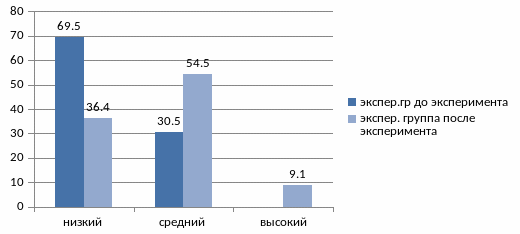 Также повысился процент среднего уровня с 30,4% до 36,4% (с 7 человек до 8 человек). Очень низкий уровень в экспериментальной группе после проведения коррекционной работы с учащимися составил 0%.