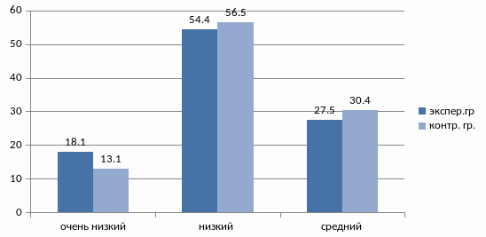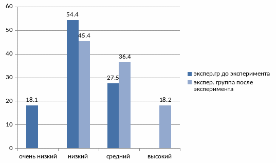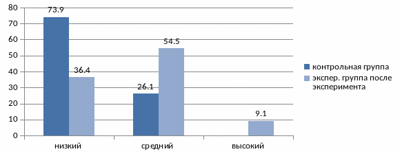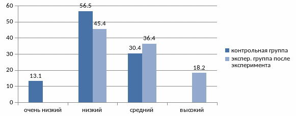 Анализ результатов показал, что в экспериментальной группе после проведенного эксперимента количество детей очень низкого уровня составило 0%, а в контрольной группе 13,1%, а количество детей показавших высокий уровень после проведения эксперимента составило 4 человека, что составляет 18,2%.