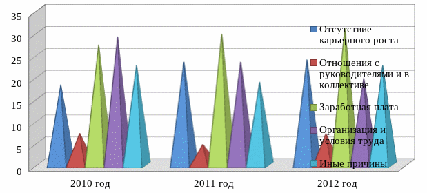 По приведенным данным в таблице 11, следует отметить, что увольняется персонал по 3-м категориям. На конец 2012 года 31 % - это заработная плата, 24% - отсутствие карьерного роста, т.е. нет продвижения своего персонал, 22 % - это иные причины. За анализируемый период наблюдается снижение динамики по условиях труда примерно на 10п.п.