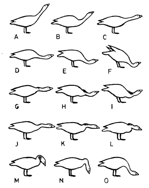 Даже при этих условиях, почти идеальных для «чистой культуры» двух мотиваций, иногда появлялись движения, которые очевидным образом нельзя было объяснить одним только взаимодействием этих двух побуждений. Про угрожающие движения A и B, когда шея вытянута наискось вверх, мы знаем, что на них накладывается независимая третья мотивация – охранное наблюдение с поднятой головой. Различие между рядами А – С и D – F, в каждом из которых представлено возрастание социального страха слева направо при примерно одинаковой агрессивности, состоит, по-видимому, лишь в разной интенсивности обоих побуждений. В то же время в формах движения от М до О несомненно принимает участие еще какая-то мотивация, природа которой пока неясна.