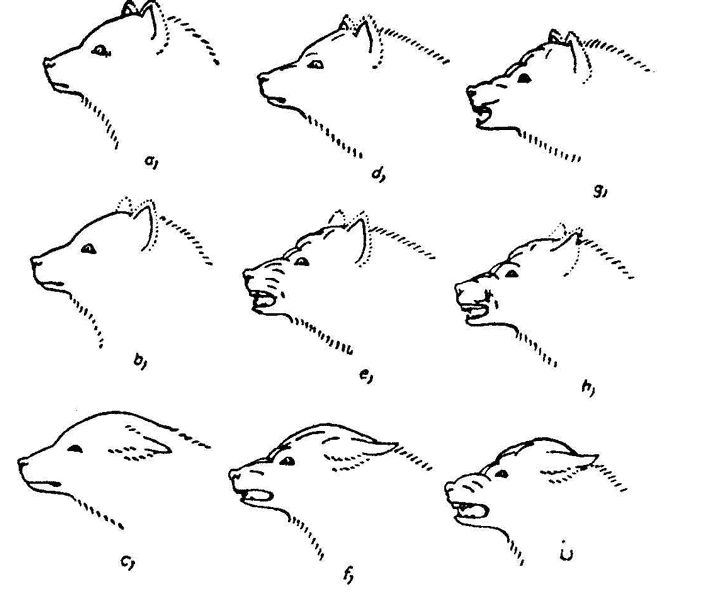Простым примером могут служить движения лицевой мускулатуры, которые можно наблюдать у собаки при конфликте между побуждениями к нападению и к бегству. Эта мимика, обычно называемая угрозой, появляется лишь тогда, когда стремление к нападению тормозится страхом, хотя бы очень легким. Если страха нет совсем, собака кусает без всякой угрозы, с такой спокойной физиономией, какая изображена в левом верхнем углу рисунка; она выдает лишь небольшое напряжение, примерно такое же, с каким собака смотрит на только что принесенную миску с едой. Если читатель хорошо знает собак, пусть он попытается, прежде чем читать дальше, самостоятельно истолковать изображенные на рисунке типы выражений. Пусть он попробует представить себе ситуацию, в которой его собака сделает такую мину. А потом, в качестве второго упражнения, пусть попытается предсказать, что она станет делать дальше.