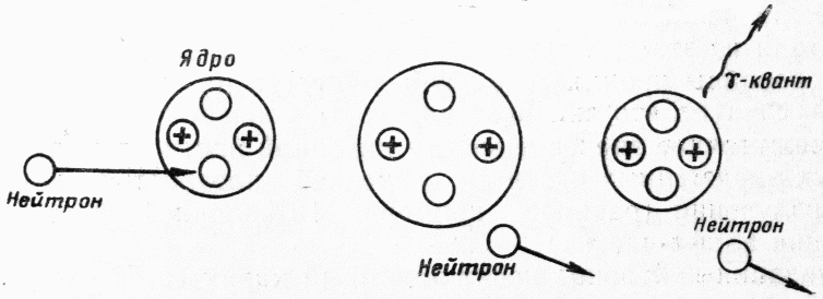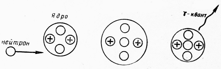 Ядро, захватив нейтрон, переходит из возбужденного в нормальное состояние с испусканием γ-кванта (наиболее часто) или заряженной частицы (редко).