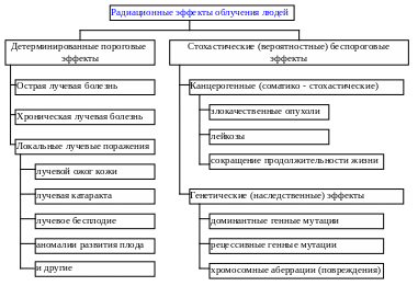 Стохастические (вероятностные) лучевые эффекты могут возникнуть как после облучения малыми, так и более значительными дозами – в будущем, т.е. через какое-то время после облучения (так лейкемия развивается через 7-12 лет, другие раковые опухоли – в течение 25 лет); но вероятность их возникновения у человека все же пропорциональна величине полученной дозы.