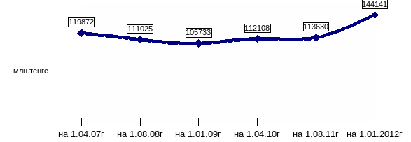 В ценные бумаги вложено 55895 млн. тенге, что больше чем на начало года в 2,6 раза или на 34325 млн. тенге. Удельный вес средств, вложенных в ценные бумаги, в общей сумме баланса составляет 24,4%.