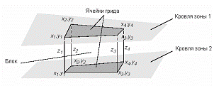 В результате поэтапного наложения двумерной сетки на слои или зоны пласта мы получаем блоки имеющие свои физические размеры как в горизонтальной проекции, так и в вертикальной (рис. 4).
