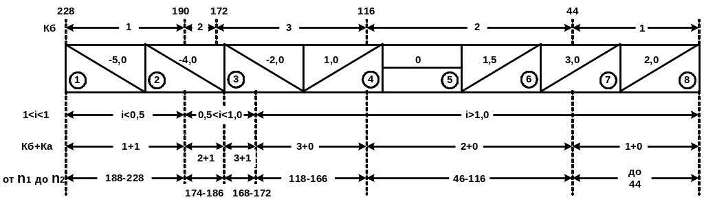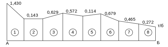 Дополняя определенное количество осей дойдем до точки, когда часть пути от точки Б окажется горизонтальной, а затем средний уклон поменяет направление (будет от точки А в сторону Б) и составит величину 0,44‰ при полном занятии пути вагонами. Это означает, что от 188 до 228 осей закрепление необходимо производить как на малых уклонах – по одному тормозному башмаку с обеих сторон состава.