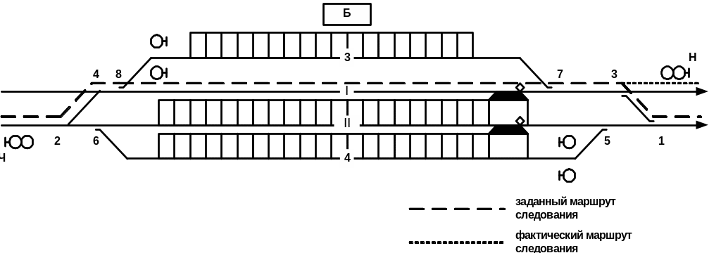 Поездной диспетчер дал команду дежурной по станции четные поезда грузовой N2494 и пригородный N6362 пропустить по первому неспециализированному пути. ДСП приготовила маршрут приема поезду N2494, установив стрелочные переводы N2/4 в минусовое положение и передала по радиосвязи приказ N7 о приеме поезда на 1-й путь при запрещающем показании входного сигнала. После этого она передала машинисту поезда N2494 приказ N8 об отправлении этого поезда на перегон с 1-гопути, не имеющего выходного сигнала. Однако стрелочные переводы N1/3 оставались в плюсовом положении и поезд N2494 был направлен по неправильному 1-у главному пути перегона, вместо правильного 2-го пути. ДСП о правильности приготовленного маршрута приема и отправления поезда ДHЦ не докладывала и он такого доклада не потребовал. Машинист поезда N2494 при проследовании стрелочной горловины увидел, что стрелочный перевод N3 стоит по прямому пути, остановил поезд, выехав головой поезда за пределы станции. По согласованию с ДСП поезд был осажен назад на 1-й путь, а затем после установки стрелочных переводов N1/3 отправлен на 2-й главный путь перегона.