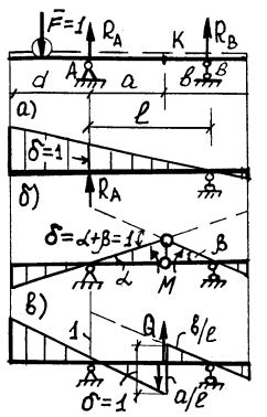 При построении линий влияния усилий Мк, Qк для фиксированного сечения “К”, расположенного между опорами, следует рассматривать два положения груза F=1 – слева и справа от сечения “К”, при этом рассматривая равновесие соответственно правой и левой отсечённых частей. В данном случае запись уравнений Мк, Qк проще. В том случае, когда сечение расположено на консоли, при движении груза F=1 слева и справа от сечения целесообразно рассматривать равновесие консольной части, считая, что груз движется от сечения.