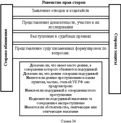 5. Правило равенства прав сторон предусматривает, что в судебном заседании стороны обвинения и защиты пользуются равными правами на заявление отводов и ходатайств, представление доказательств, участие в их исследовании, выступление в судебных прениях, представление суду письменных формулировок по вопросам, указанным в п. 1 – 6 ст. 299 УПК РФ: